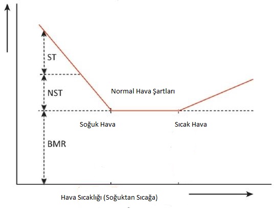 Hafif soğuk ortamda ve sıcak ortamda resimde görüldüğü gibi metabolizma hızı artmaktadır. Bu artış soğukta, hem kahverengi yağ dokusunun çalışmasıyla (titremeden ısı oluşumu) ve kasların çalışmasıyla (titreyerek ısı oluşumu); sıcakta ise terleme ile olmaktadır.